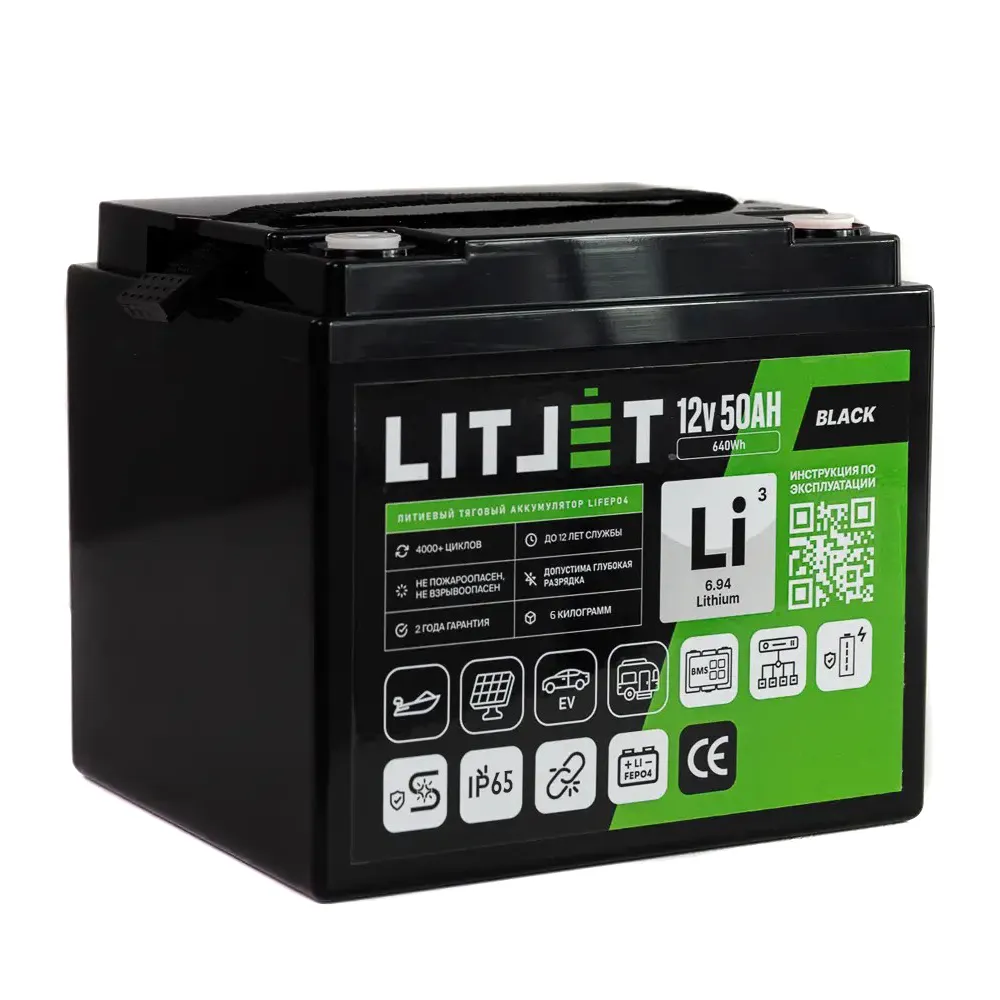 Аккумулятор LITJET BLACK LiFePO4 12V 50Ah 640Wh IP65 – надежный и долговечный источник энергии для ИБП (бренды: Eaton, Delta Electronics, Riello, Powercom, HIDEN, APC, CyberPower и другие), охранных систем, эхолотов, а также компактных солнечных батарей (простая замена свинцовой батареи).