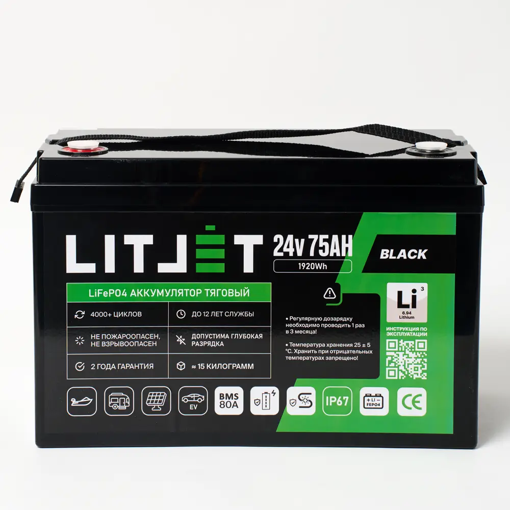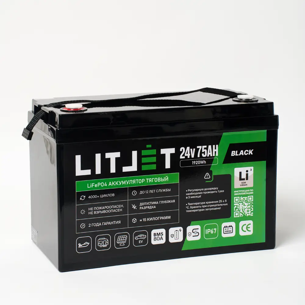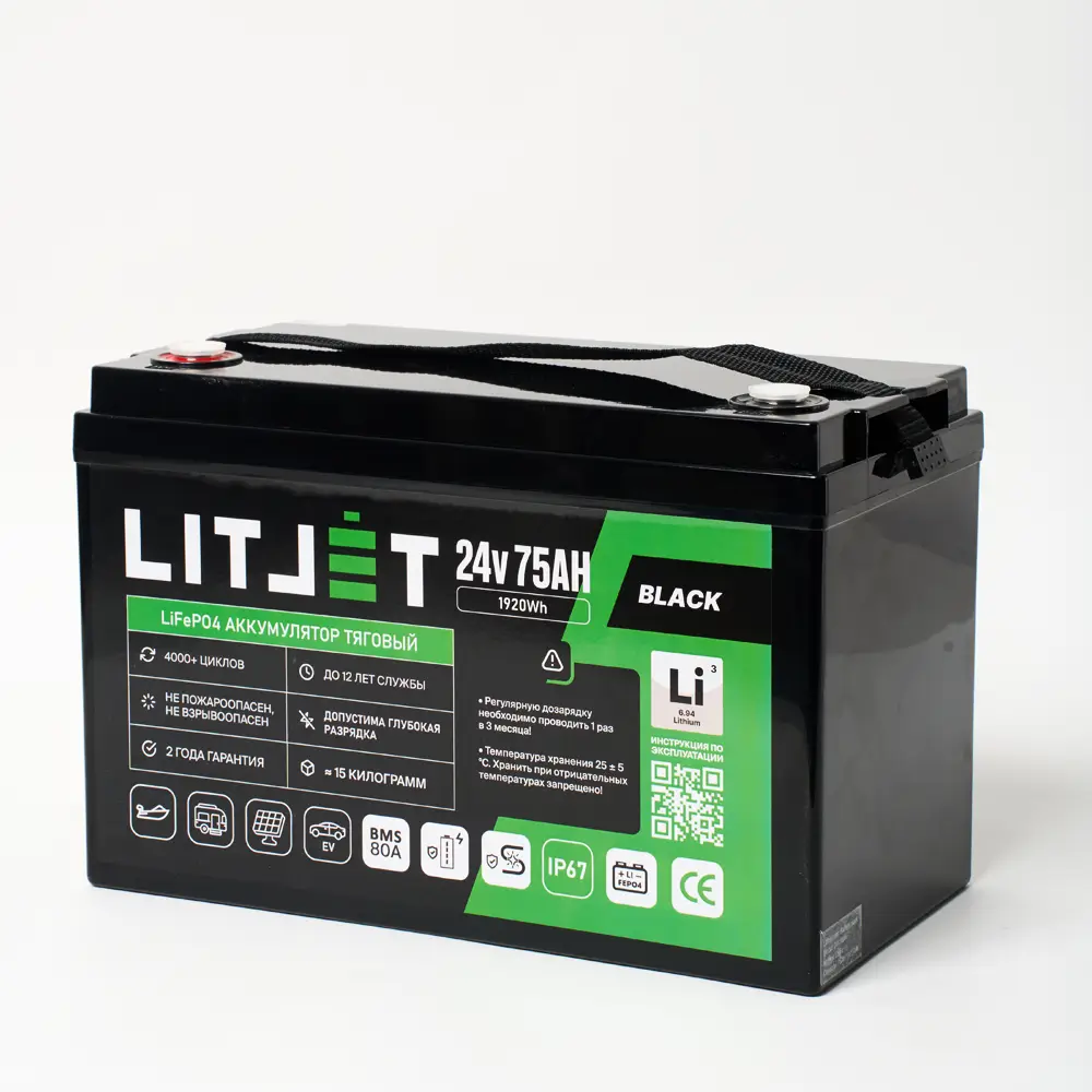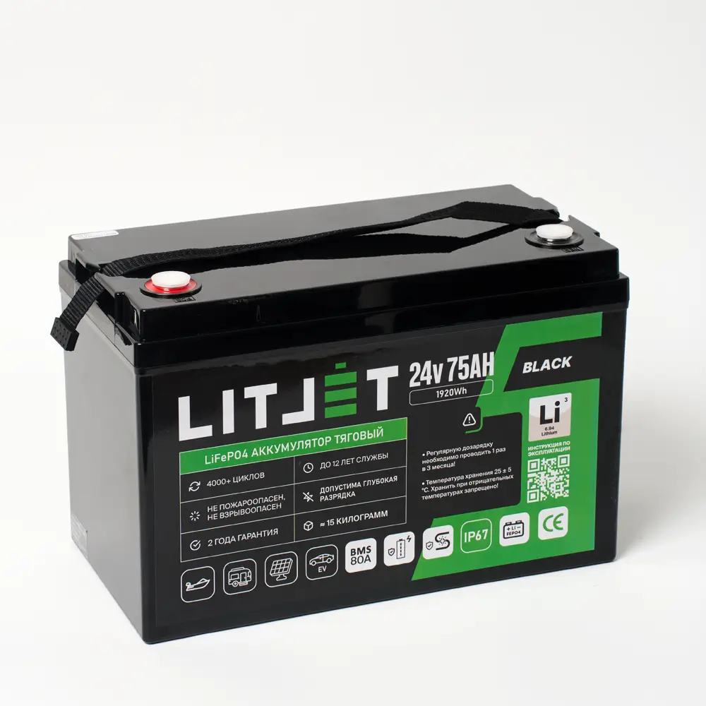 Аккумулятор LITJET BLACK LiFePO4 24V 75Ah 1920Wh IP67 BMS 80А – надежный и долговечный источник энергии для поломоечных машин, ИБП (бренды: Eaton, Delta Electronics, Riello, Powercom, HIDEN, APC, CyberPower и другие), охранных систем, эхолотов, а также компактных солнечных батарей (простая замена свинцовой батареи). Используйте подходящие зарядные устройства — это продлит срок службы аккумулятора.