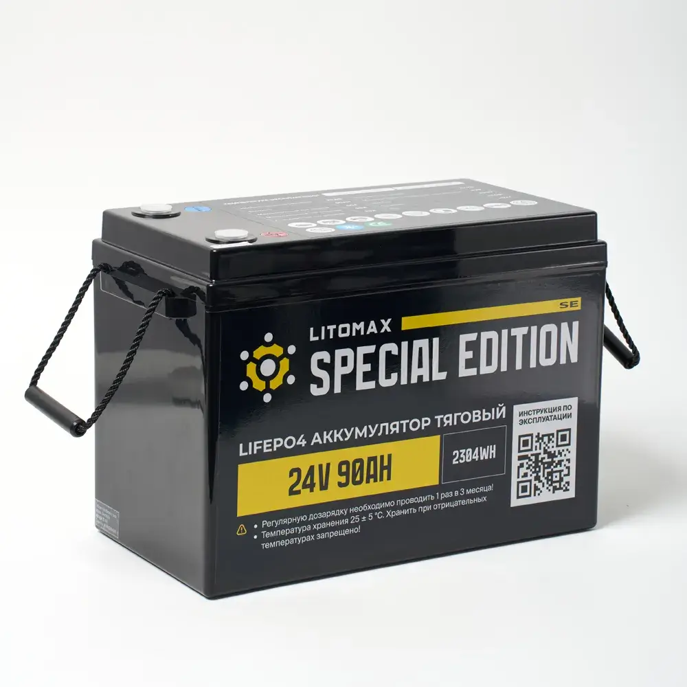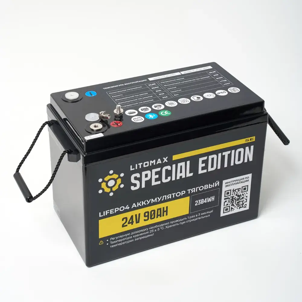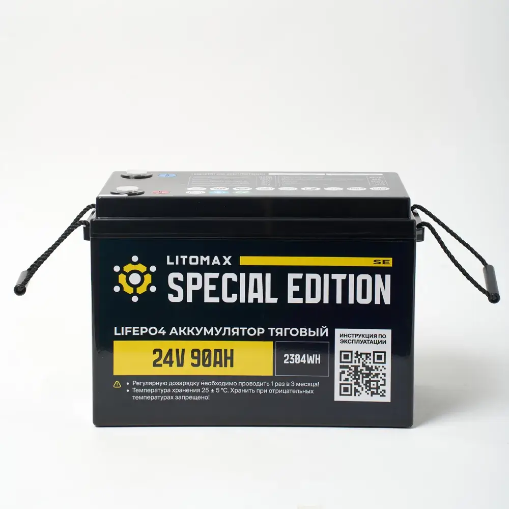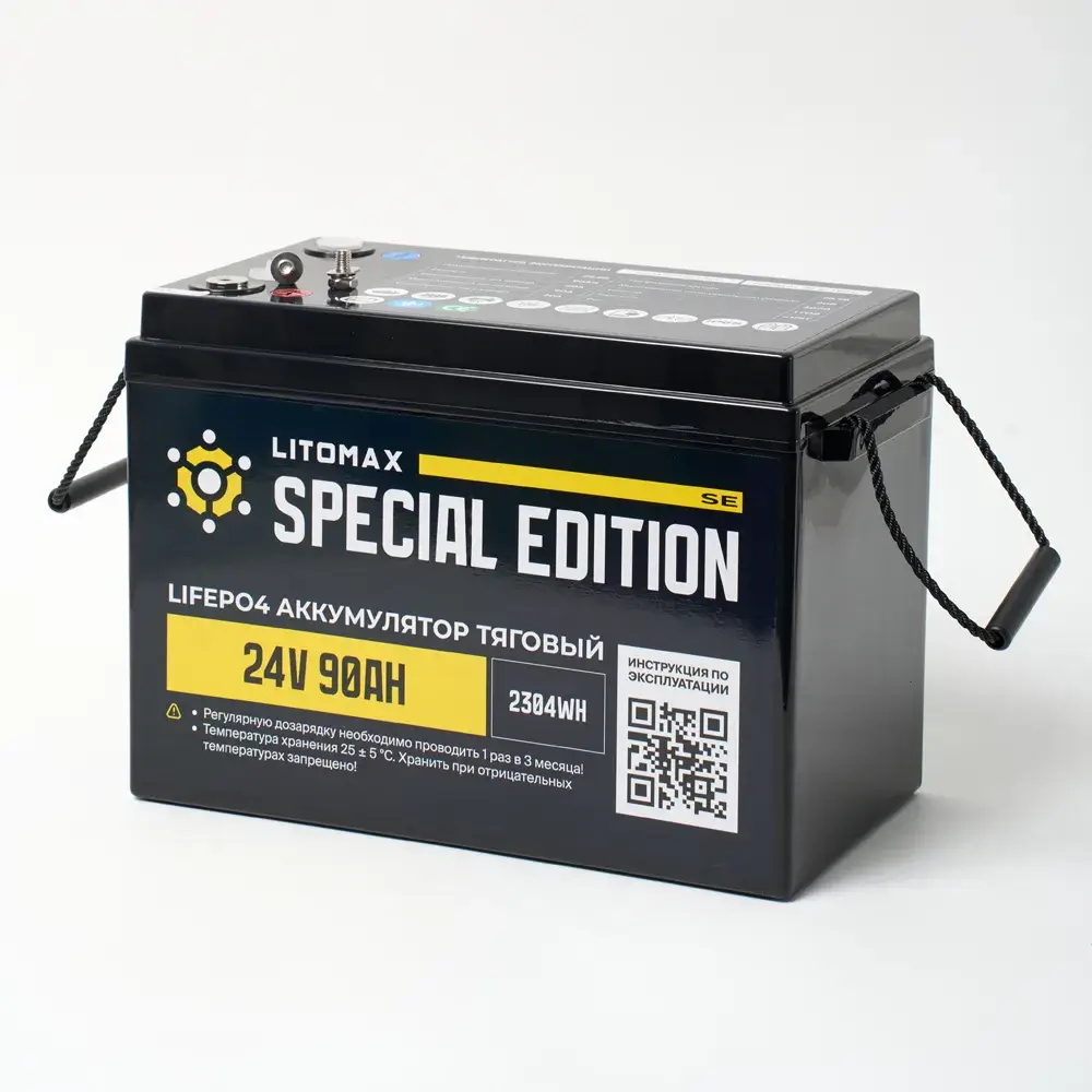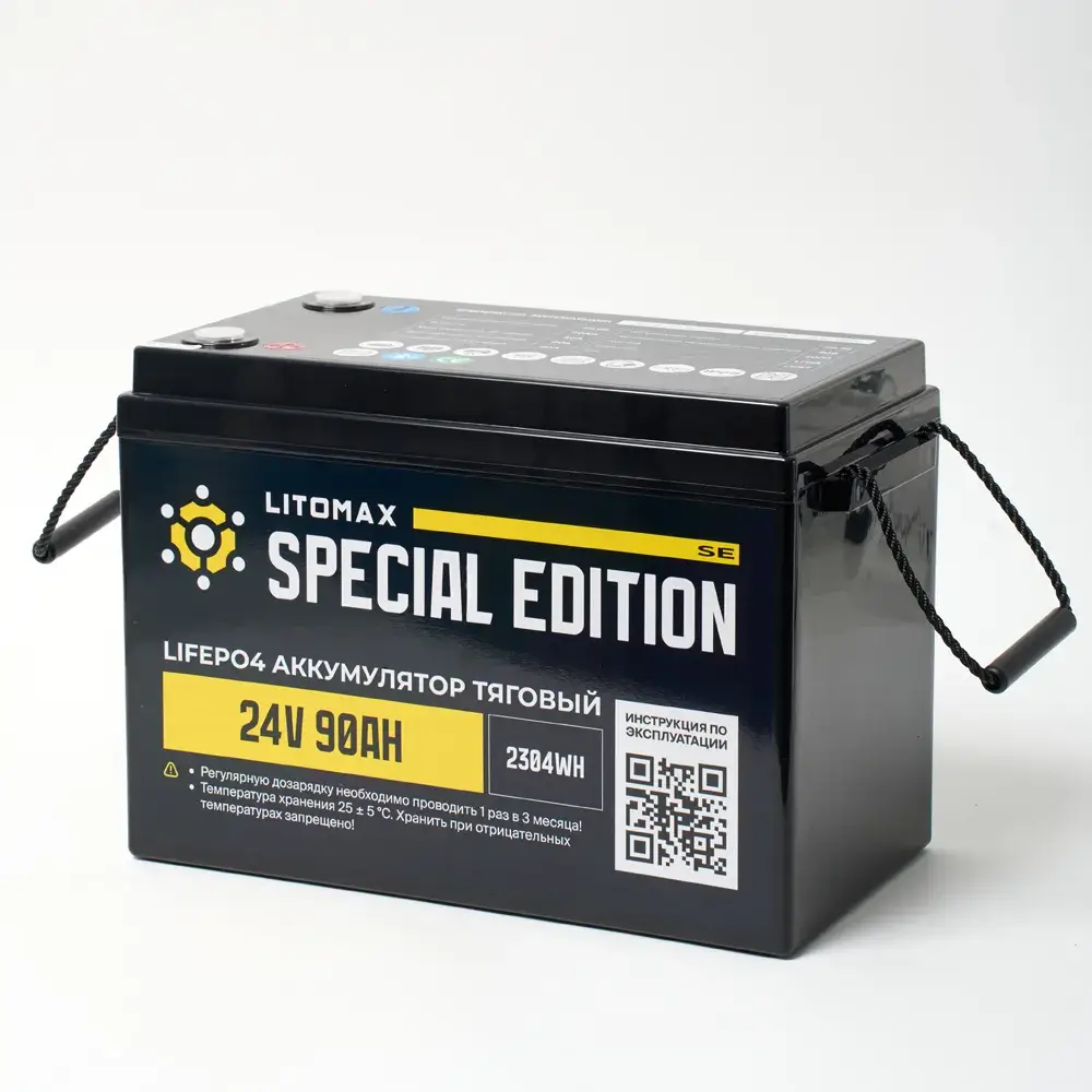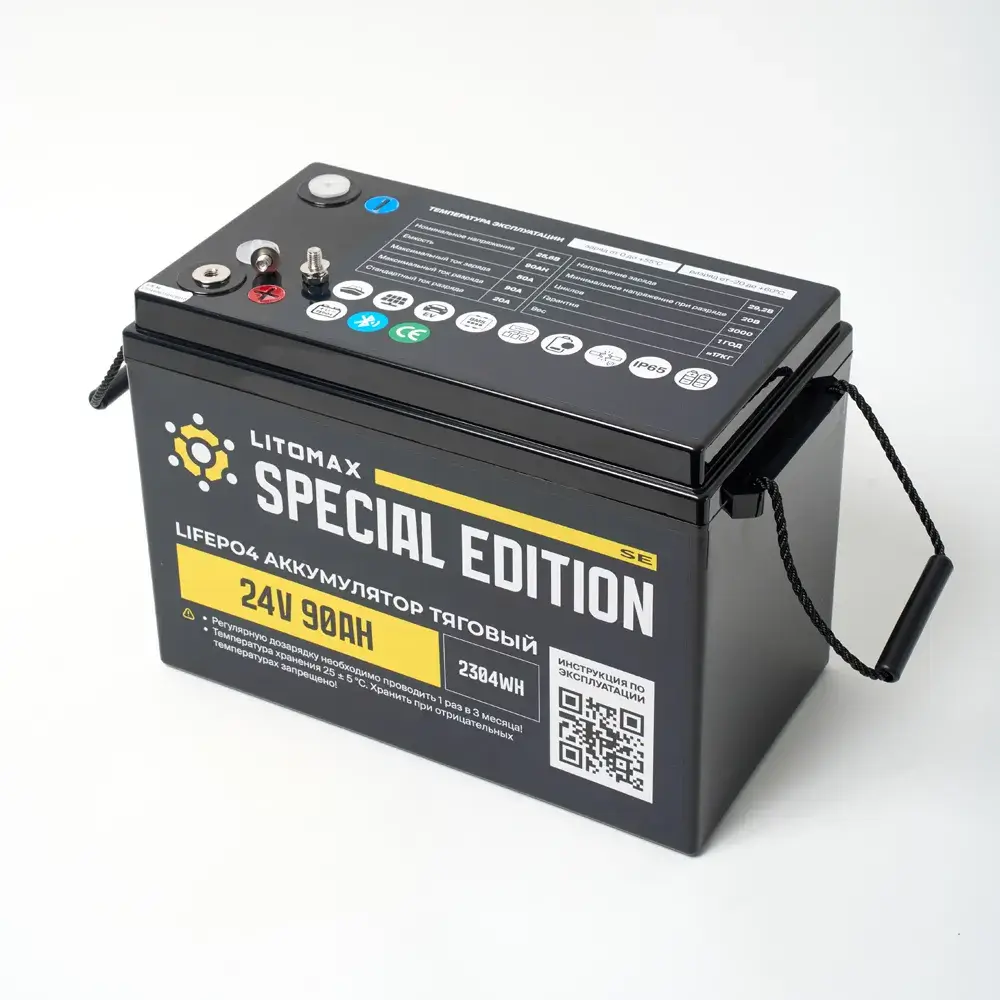 Литий железо-фосфатный аккумулятор (LiFePO4) тяговый ЛИТОМАКС имеет напряжение 24 вольт, предназначен для работы в глубоких циклах разряда и заряда. Не может быть использован для запуска ДВС. Относится к тяговым аккумуляторам.