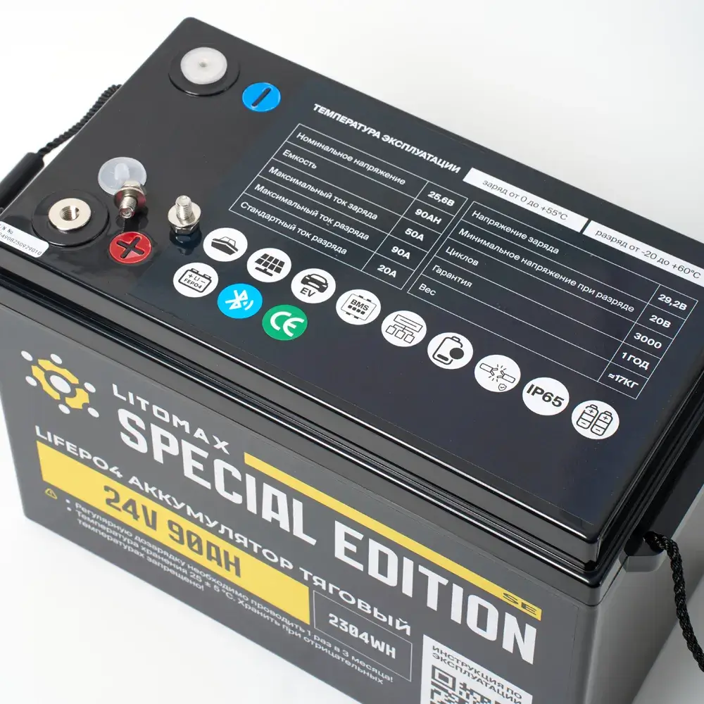 Аккумулятор ЛИТОМАКС LiFePO4 24V 90Ah c Bluetooth BMS 90A – надежный и долговечный источник энергии для поломоечных машин, ИБП (бренды: Eaton, Delta Electronics, Riello, Powercom, HIDEN, APC, CyberPower и другие), охранных систем, эхолотов, а также компактных солнечных батарей (простая замена свинцовой батареи). Используйте подходящие зарядные устройства — это продлит срок службы аккумулятора.